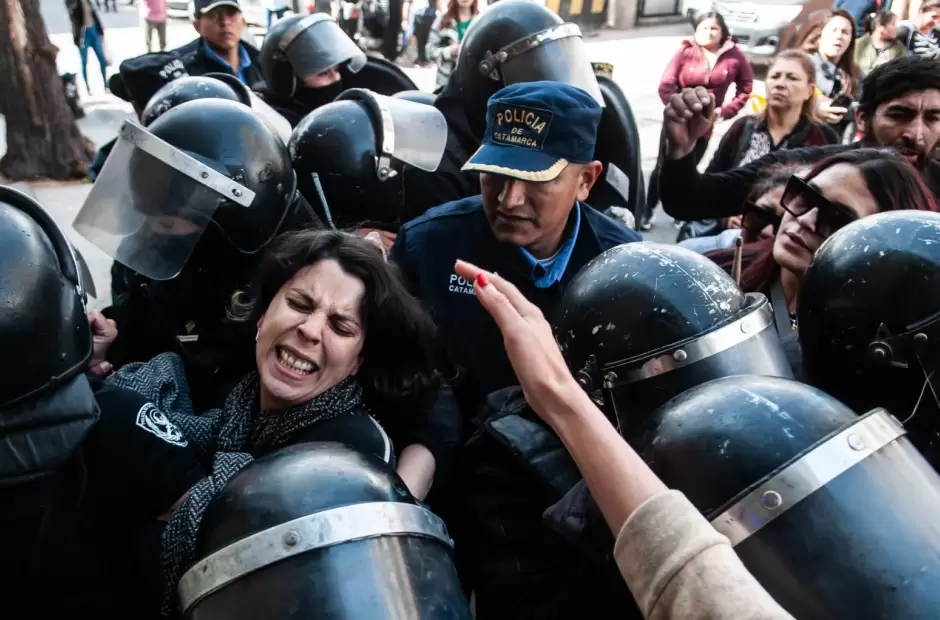 mente terminaron por formar un cordón y “alejar” a los manifestantes del ingreso de la Cámara. Situación que llevó también a cerrar las puertas de una oficina pública lindante al edificio judicial. En el forcejeo, una mujer que acompañaba a Belén, resultó con un golpe, según dijeron, de una cachiporra, en su brazo izquierdo, pero no fue necesaria la presencia de la ambulancia. Si bien los manifestantes le reclamaban a la policía por “el violento accionar”, Belén, una de las víctimas les pedía tranquilidad refiriendo que la policía solo cumplía órdenes y quienes deben impartir justicia son los jueces y el fiscal, descomprimiendo así el tenso enfrentamiento entre manifestantes y policías.