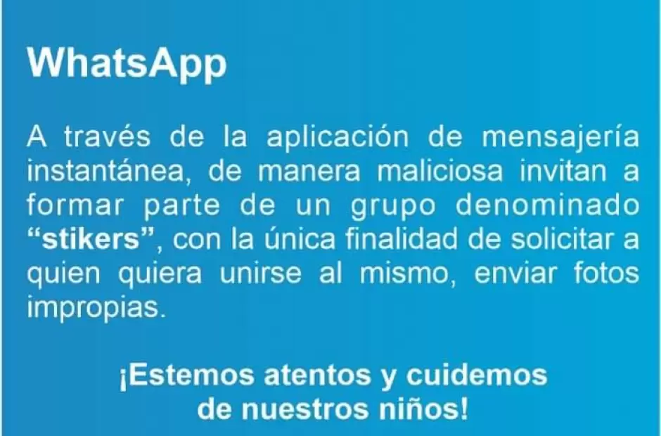 Lo que advierten es que a través de la aplicación de mensajería instantánea de manera maliciosa invitan a formar parte de un grupo denominado "Stikers", con la única finalidad de solicitar a quien quiera unirse al mismo, en fotos impropias.