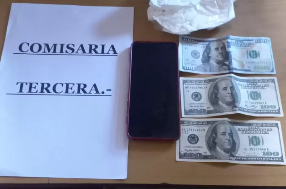 Después llega López Pedro Vicente de 24 años en una motocicleta en una motocicleta CG TITAN, entregando en un papel envuelto en cinta la suma de 300 dólares. Informado el fiscal Dr. Laureano Palacios ordenó la detención de ambos y el secuestro de los teléfonos la motocicleta y la plata. denuncia en la U.J.N3