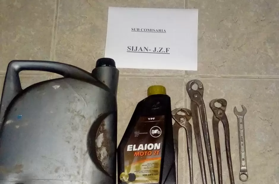 Tras llevar a cabo un registro domiciliario, bajo las directivas de la Fiscalía de la Segunda Circunscripción, en una vivienda donde reside la familia Toledo, los policías lograron recuperar tres tenazas, una llave n° 13, un bidón de aceite Elaion para moto y un bidón de 5 litros con gasoil.