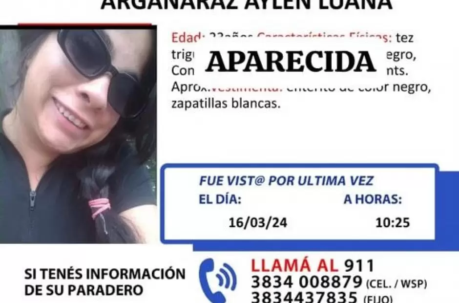 Desde la Policía de Catamarca y la División Trata de Personas, informaron que lograron dar con el paradero de Argañaraz Aylen Luana, una joven de 23 años que está ausente de su hogar desde las 10:25 de la mañana de hoy.