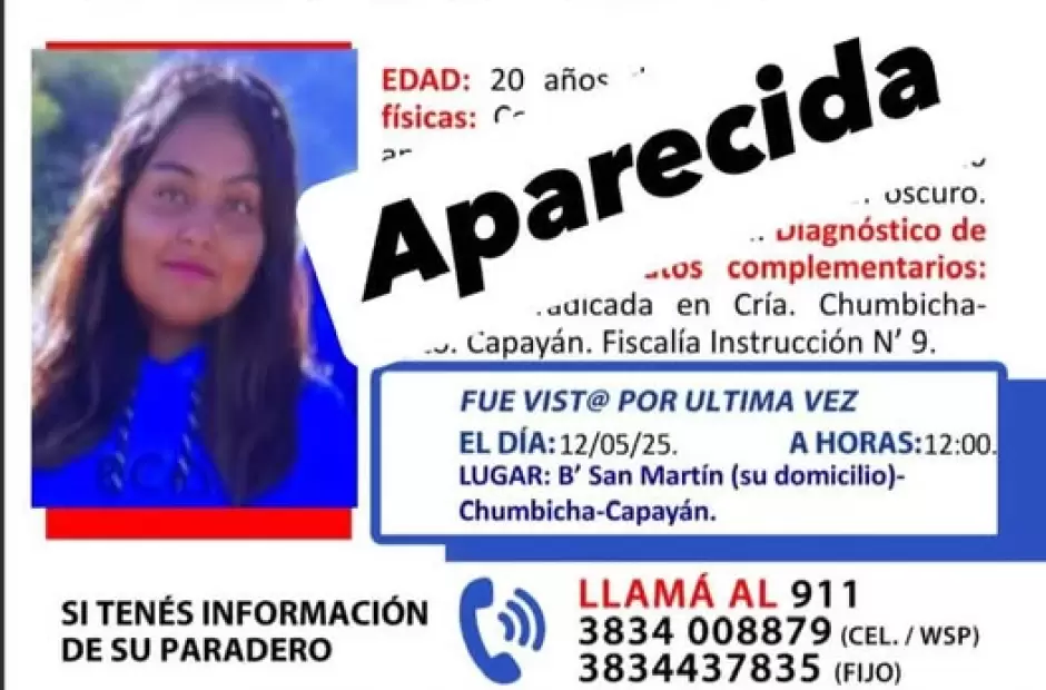 Recordemos que la investigación estuvo a cargo de la Fiscalía de Instrucción N° 9, con intervención de efectivos de la Comisaría departamental Chumbicha, quienes trabajaron activamente para localizar a la joven y esclarecer los hechos que rodean su desaparición.