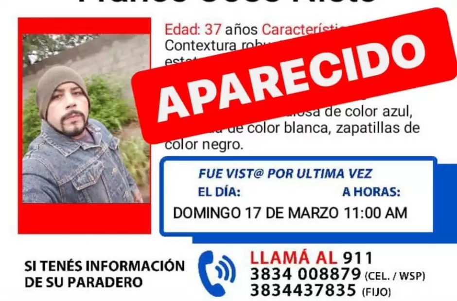 La División Trata de Personas, en la última hora, compartieron la noticia sobre la aparición de Franco José Nieto, un hombre de 37 años, que estuvo ausente de su hogar desde las 11:00 hs de este domingo.