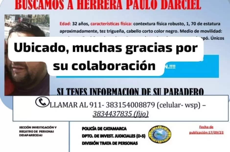 Se trata de Paulo Darciel Herrera de 32 años y por ello el organismo agradece a la comunidad por haber colaborado en la difusión de esta información.