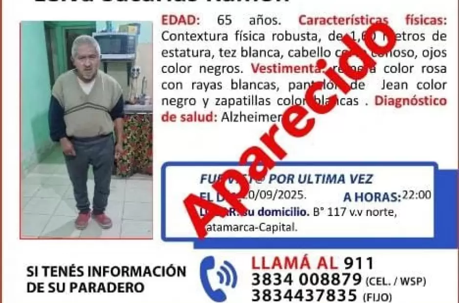 La Policía de Catamarca confirmó que dieron con el paradero de Leiva Sacarías Ramón, un hombre de 65 años que padece Alzheimer que se encontraba desaparecido desde la noche de este sábado.