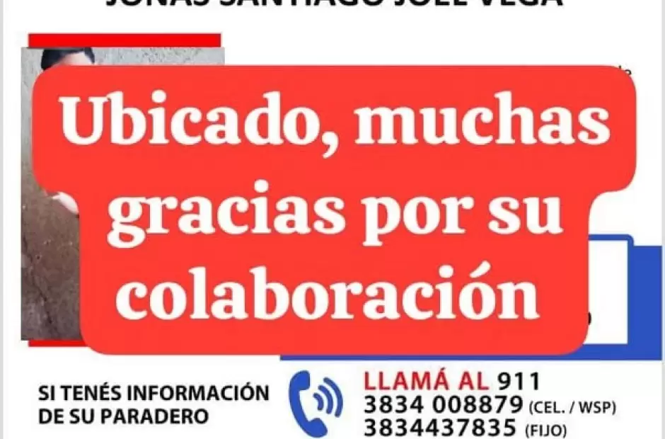 Se trata de Jonás Santiago Joel Vega, quien estuvo ausente desde las 10: 20 hs de este mismo martes. El menor se encuentra sano y salvo con su familia. Se agradece a la comunidad por su colaboración.