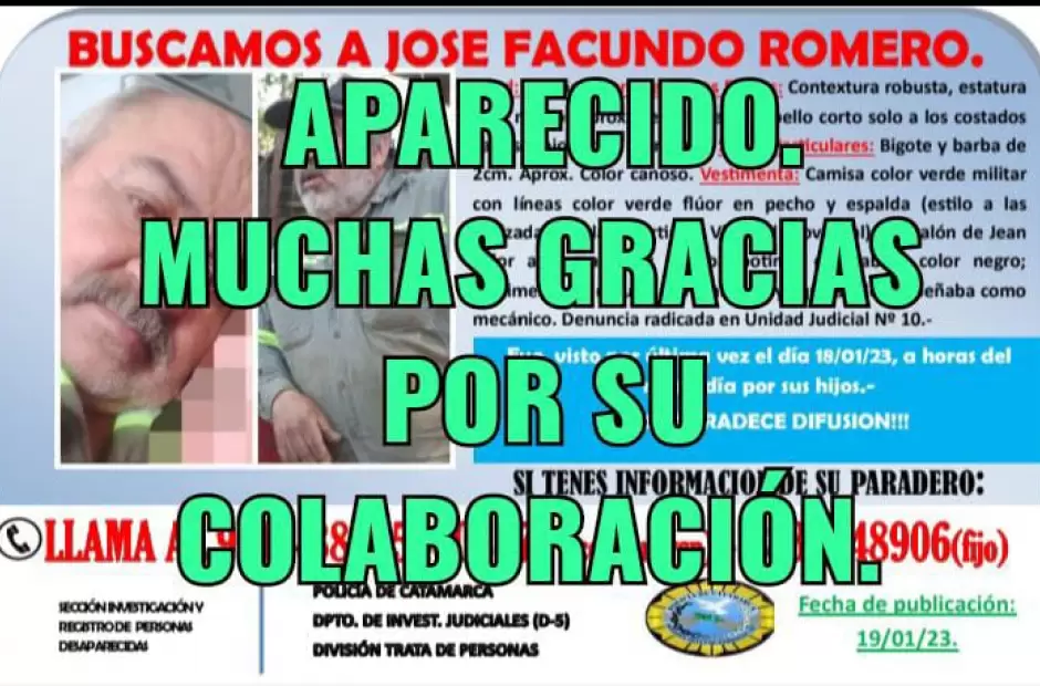 José Facundo Romero, en apenas 24 horas fue encontrado este jueves. Según se conoció extraoficialmente, este fue ubicado en la localidad de La Merced. hasta allí se había dirigido con uno de sus hijos, en búsqueda de trabajo.