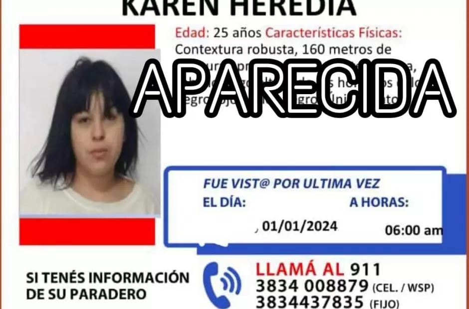 Se trata de Karen Heredia, quien fue vista por última vez en la mañana de año nuevo, precisamente a las 06:00 hs, después de que denunciaron la desaparición, la División de Trata, en conjunto con sus pares de la policía provincial, iniciaron la búsqueda intensa de la joven y publicaron su imagen en las redes oficiales: