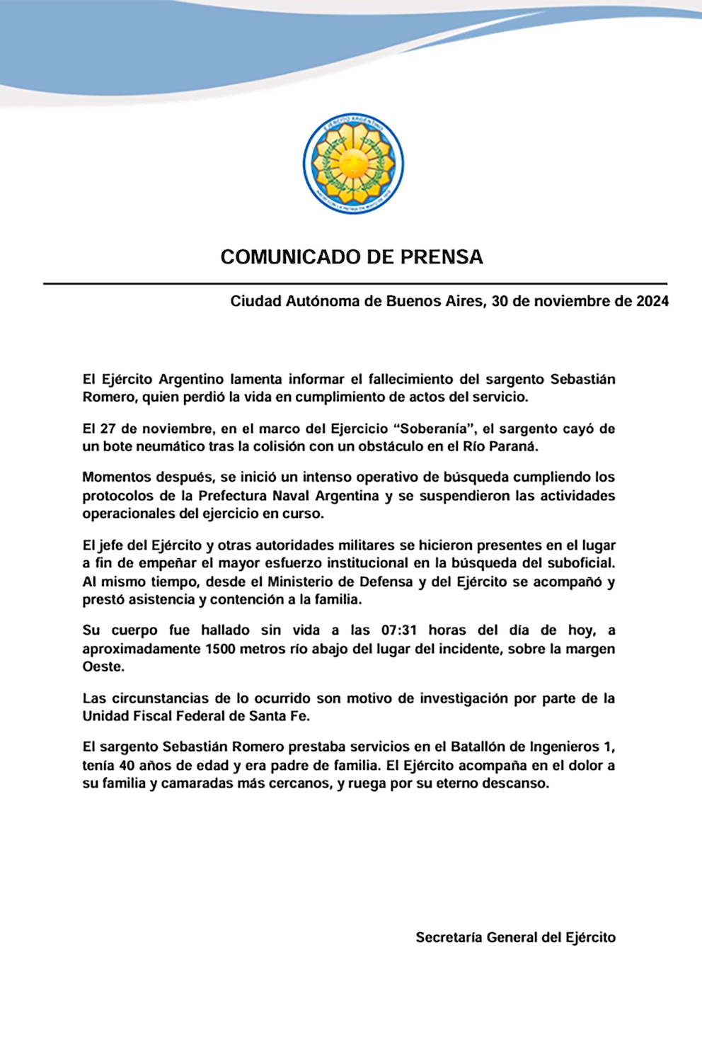 Además, añadió: "El jefe del Ejército y otras autoridades militares se hicieron presentes en el lugar a fin de empeñar el mayor esfuerzo institucional en la búsqueda del suboficial. Al mismo tiempo, desde el Ministerio de Defensa y del Ejército se acompañó y prestó asistencia y contención a la familia".
