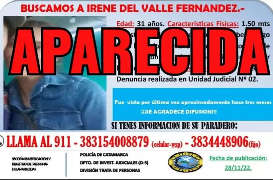 Se trata de Irene del Valle Fernández, quien con 31 años había sido vista por sus familiares por última vez hace tres meses. Estos habían formulado la denuncia por su desaparición en la Unidad Judicial nº 2.