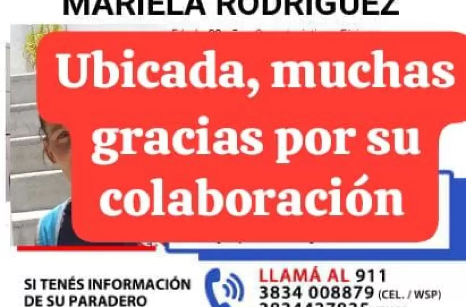 Según informaron a través de sus redes sociales, luego de averiguaciones llevadas a cabo de manera conjunta por personal de la División Trata de Personas de la Policía de Catamarca y de la Comisaría Seccional N° 14 de la Ciudad de La Banda, Provincia de Santiago del Estero, en esa Ciudad, se logró ubicar a Mariela Rodríguez (38), quien se encuentra en buen estado de salud.