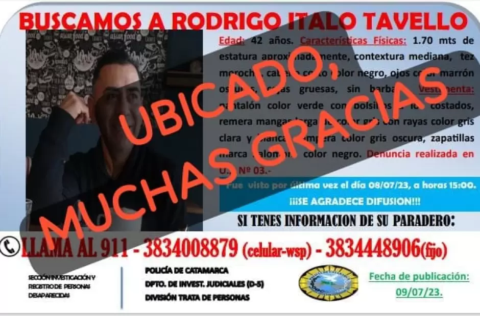 La División de Trata de Personas de la Policía de la Provincia informó que Rodrigo Italo Tavello, que era intensamemte buscado desde el pasado sábado, finalmente fue ubicado.