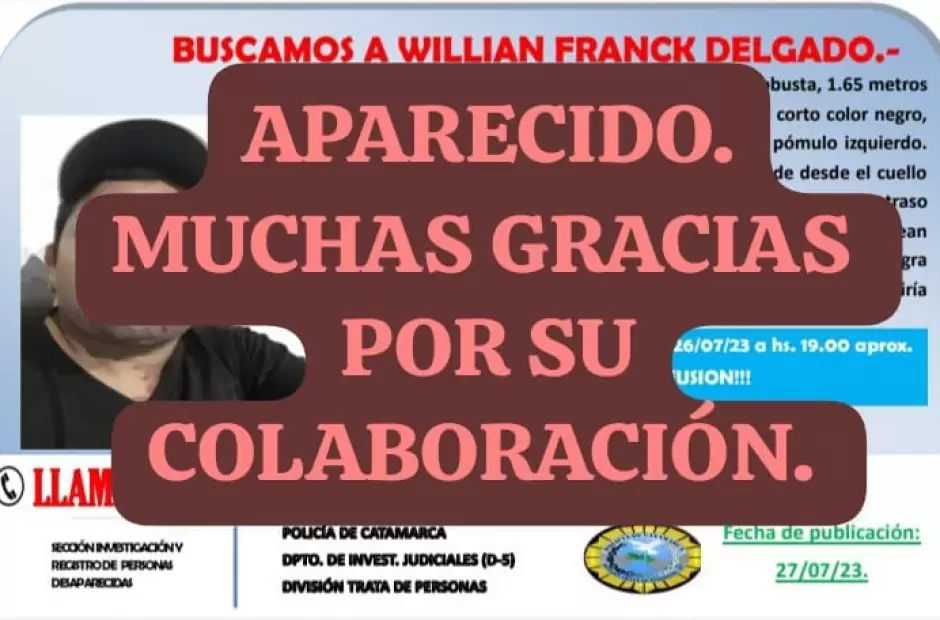 De manera que Willian Franck Delgado de 36 años, cuya desaparición había sido denunciada en la Unidad Judicial n°1, ya fue aclarada para los organismos oficiales.