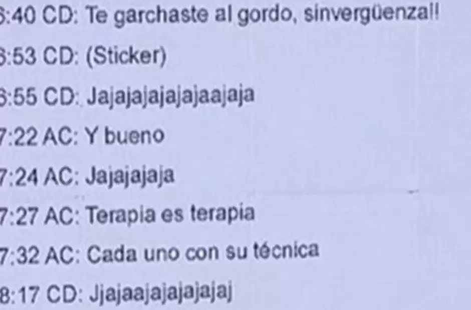 Ojeda mostró un chat entre Cosachov y el psicólogo Carlos Díaz, quien le dijo: "Te gar***** al gordo, sinvergüenza!!!!". Y la mujer le respondió: "Y bueno, jaja, terapia es terapia. Cada uno con su técnica, jaja".