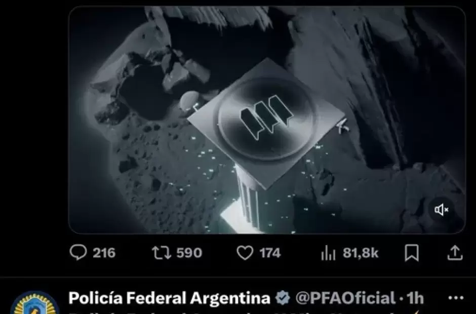 La cuenta oficial de la Policía Federal Argentina (PFA) en la red social X fue hackeada este viernes y utilizada para promocionar una criptomoneda. Durante algunos minutos se publicaron mensajes vinculados a un supuesto "airdrop" de la moneda virtual $MIRA, hasta que el contenido fue eliminado.