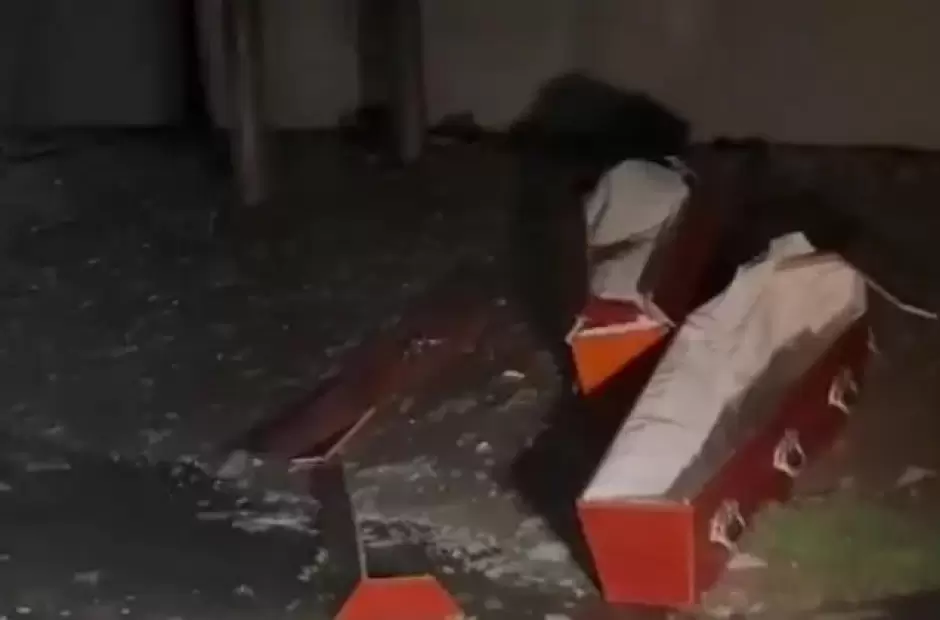 En medio del temporal, los féretros quedaron deshechos a pocos metros de la empresa de servicios fúnebres, asombrando a los transeúntes que se ubicaban en la esquina de la Ruta 8 y Domingo French.