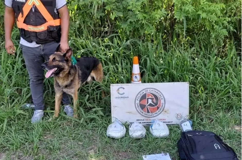 En la tarde del miércoles, mientras efectivos de las Divisiones Investigaciones e Inteligencia y Canes Antinarcóticos, dependientes de la Dirección Drogas Peligrosas de la Policía de la Provincia, realizaban operativo de control vehicular e identificación de personas en la Ruta Nacional N° 38, a la altura del puesto de control de la localidad de La Viña, departamento Paclín, fueron alertados que a unos 400 metros aproximadamente del lugar, personas desconocidas se habrían despojado de una mochila.