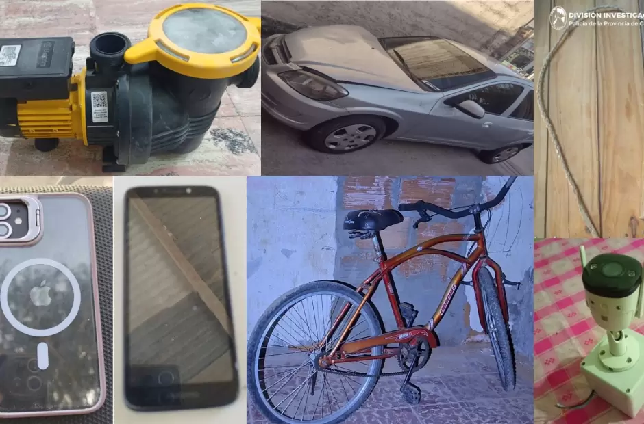En los lugares, los policías incautaron un látigo y un automóvil Chevrolet Celta, que habrían sido utilizados para perpetrar ilícitos, como así también lograron recuperar una cámara de seguridad, una bicicleta, dos teléfonos celulares y una bomba de agua.