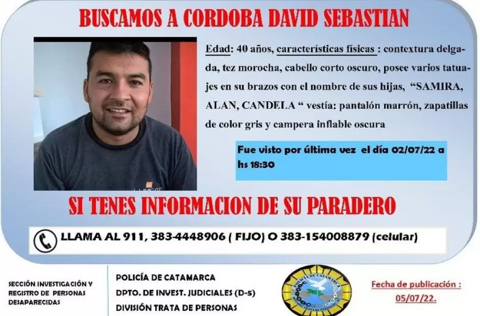 La División de Trata de Persona emitió una alerta por la desaparición de un ciudadano de 40 años identificado como David Sebastián Córdoba.