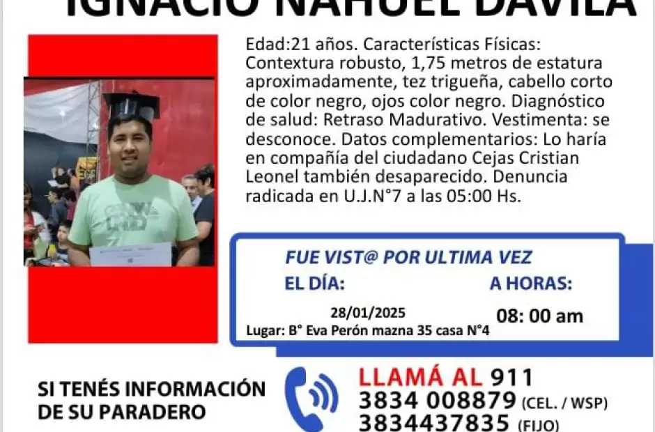 La Policía de la provincia solicita la colaboración de la comunidad para dar con el paradero de dos jóvenes. Uno se llama Ignacio Nahuel Dávila, quien tiene 21 años y según lo informado tiene retraso madurativo. Este joven fue visto por última vez este martes a las ocho de la mañana, consignándose que se encontraba en compañía de Cristian Leonel Cejas de 26 años, quien tiene el mismo diagnóstico.