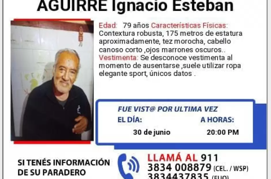 La Policía de la provincia solicita a la comunidad información para poder dar con el paradero de Ignacio Esteban Aguirre, de 79 años, quien está desaparecido desde el pasado 30 de junio. Esta persona, según se informó es de contextura robusta y mide 1.75  y es de tez morocha.