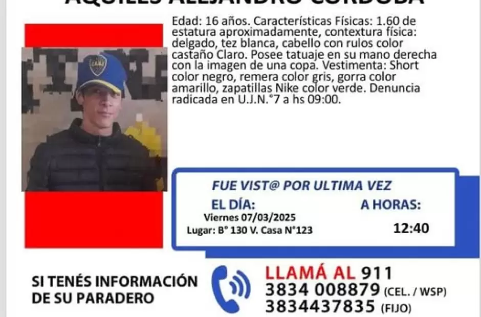 Aquiles, para mayores datos, mide 1.60 mts, es de contextura física delgada, tez blanca, es de cabello rubio con rulos. Se informó que posee tatuaje en su mano derecha con la imagen de una copa y que la última vez vestía short negro, remera gris, gorra amarilla y zapatillas Nike verdes.