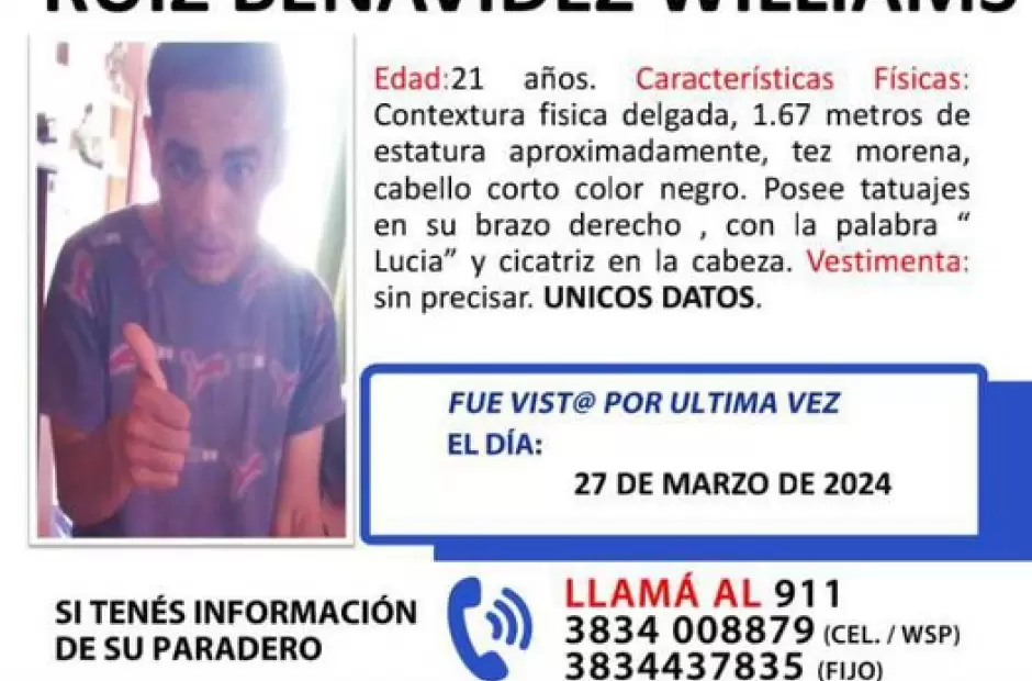 En cuanto a los datos, se informó que Williams es de contextura delgada, mide 1.67mts, es de tez morena y cabello negro. El joven posee tatuajes, uno en el brazo derecho que dice “Lucía” y como seña extra, se indicó que tiene una cicatriz en la cabeza.