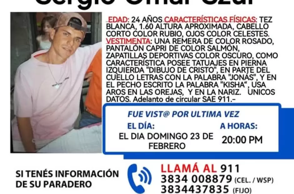 La última vez fue visto con remera rosada, pantalón capri color salmón y zapatillas de color oscuro. Para mayores datos, Sergio posee un tatuaje en pierna izquierda de un dibujo de Cristo, en la parte del cuello con las letras "Jonás" y en el pecho la palabra "Kisha".