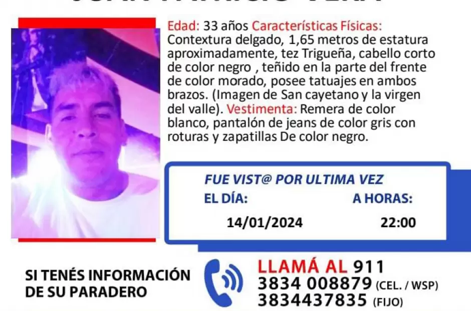 La Policía de la Provincia solicita la colaboración de la comunidad para poder dar con el paradero de Juan Patricio Vera. El joven de 33 años fue visto por última vez el domingo 14 a las 22 hs.