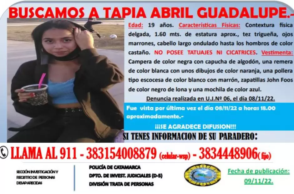 Los datos aportados por la División de Trata de Personas, que depende la Policía de la Provincia, indican que la jovencita de 19 años es de contextura delgada. Abril mide un 1.60 mts, es de tez trigueña y tiene cabello largo y ondulado hasta los hombros.