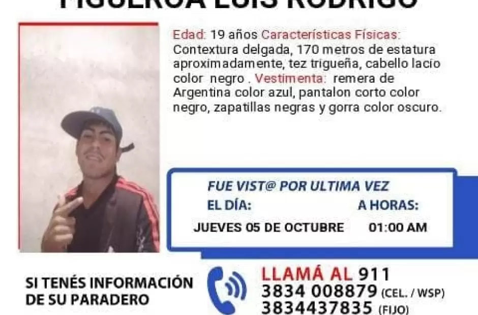 La Policía de la Provincia solicita la colaboración de la comunidad para dar con el paradero de Luis Rodrigo Figueroa. El joven tiene 19 años y fue visto por última vez el jueves a la una de la madrugada.