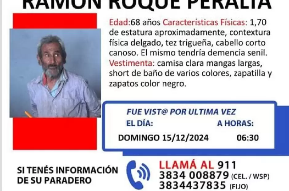 La policía de la provincia solicita a la comunidad colaboración para dar con el paradero de Ramón Roque Peralta. El hombre de 68 años fue visto por última vez este domingo a las 6.30 hs