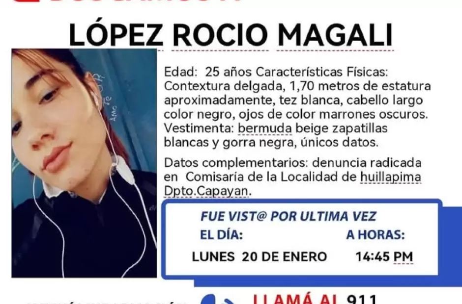 La familia de la joven denunció en la Comisaría de Huillapima ante su ausencia. Roció tiene contextura física delgada con una altura de 1,70 metros, tez blanca, cabello largo color negro, ojos marrones oscuros.