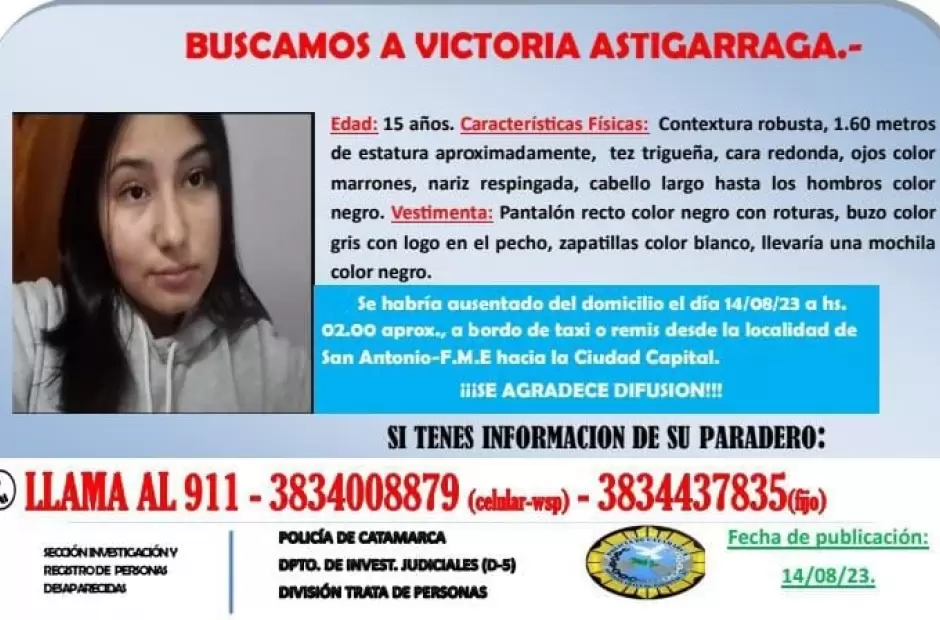 Según de informó, Victoria Astigarraga se ausentó a las dos de la mañana de su hogar tras subirse a un remis o taxi, esto en la localidad de San Antonio, en Fray Mamerto Esquiú con destino a Capital. Desde ese momento la familia no ha tenido contacto de nuevo con la menor.