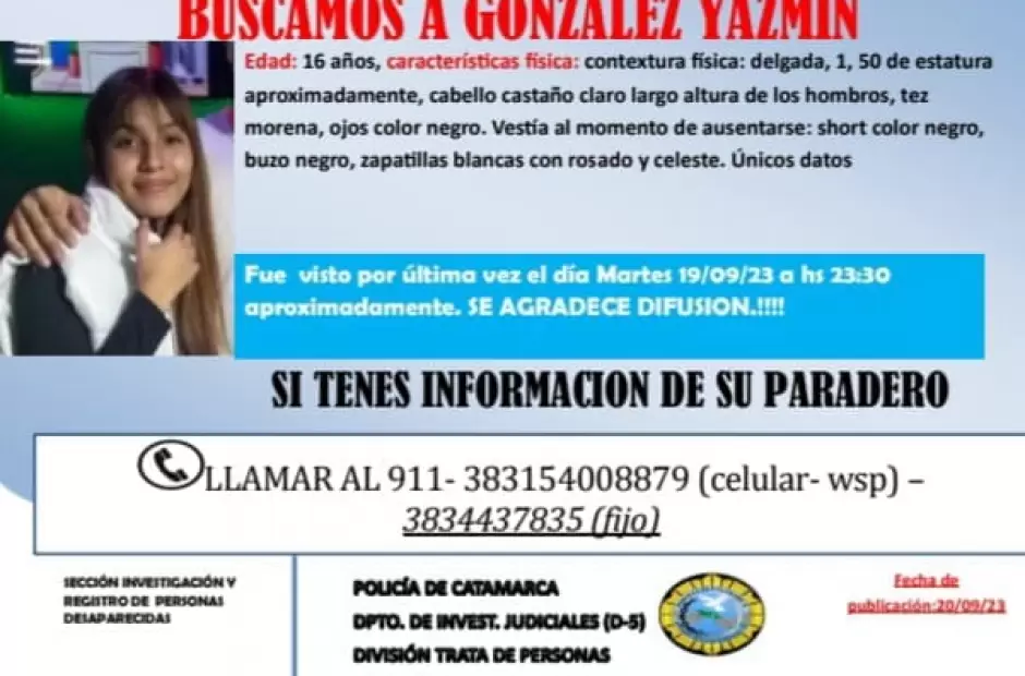 La Policia de la provincia solicita la colaboración de la comunidad para dar con el paradero de una menor de 16 años, identificada esta como Jazmín González.