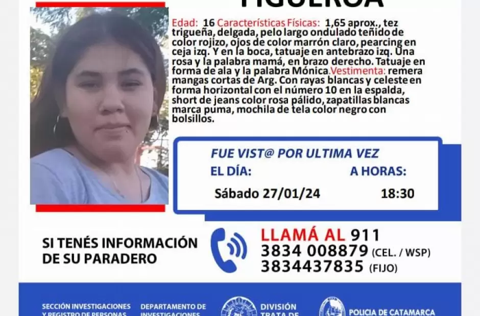 Quienes posean información, favor de comunicarla al 911 ó al 3834 008879 ó al 3834 437835.