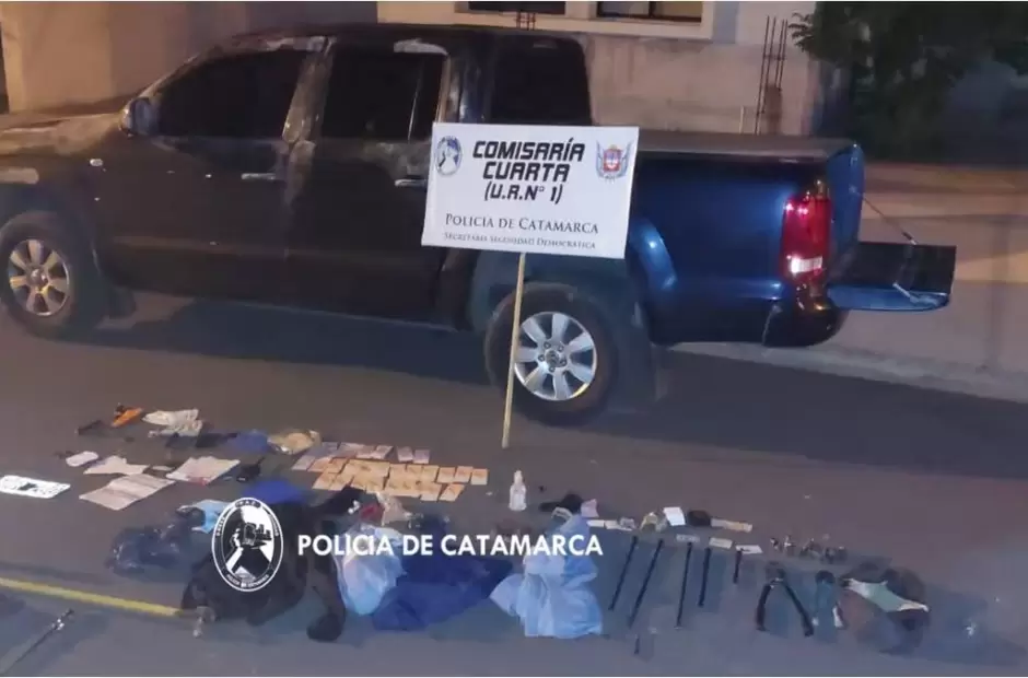 Según pudo establecer la policía, los sospechosos, de apellido Bazán y Vaquel, se trasladaban en una camioneta Ford Ranger, la que, al ser requisada, tenía en su interior $20.000, 100 dólares, espaditas, barretas, un mango de fuerza, tubos antirrobos, equipos de HT, un arma blanca, un gato hidráulico, un teléfono celular, guantes, gorras, un reloj y documentación varia.