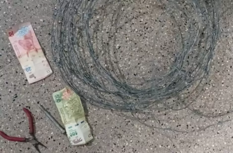 Tras aprehenderlo, se le secuestro un rollo de alambre de púa el cual habría sustraido del mismo domicilio, un teléfono celular marca Motorola modelo E 40, una pinsa punta fina con su mango de color rojo, $520 en efectivo y por último un tornillo exagonal de aproximadamente 10cm.