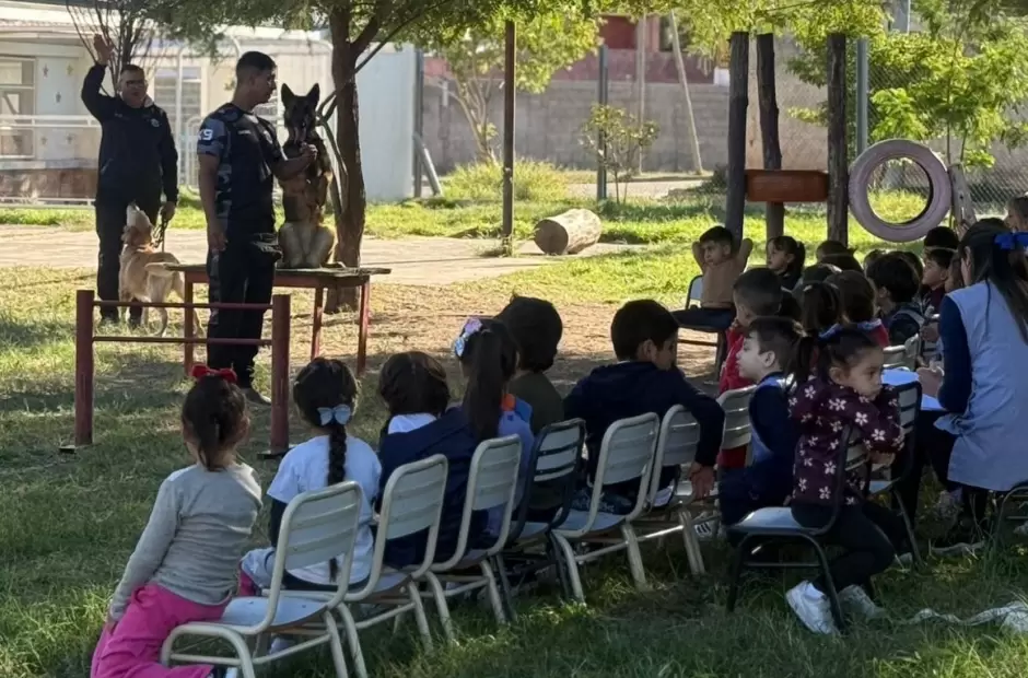 La jornada se desarrolló como una instancia de acercamiento entre las fuerzas de seguridad y la comunidad educativa, con especial foco en los niños del nivel inicial. En ese contexto, los policías llevaron adelante una actividad orientada a transmitir conocimientos sobre el rol que cumplen los canes en el ámbito de la seguridad y en la vida cotidiana.
