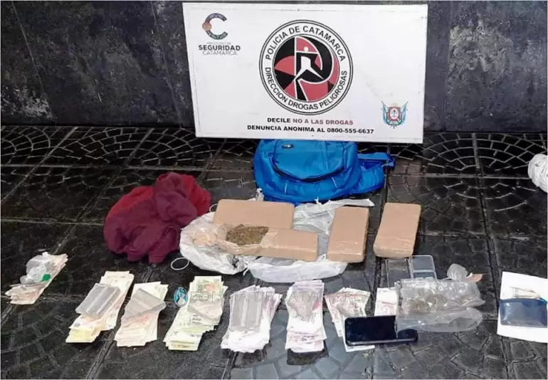 Como resultado de la pesquisa, los efectivos lograron determinar que este masculino usaría otra identidad, en virtud de lo cual se montó un operativo en la zona, logrando detener en la vía pública a un joven de 29 años, a quien al requisarle las pertenencias que llevaba, encontraron en el interior de un bolso y una mochila cuatro (04) panes compactados de una sustancia tipo herbácea, que luego de ser sometida a la prueba de campo correspondiente arrojó que se trataría de 2,559 kg. de Marihuana, dos (2) envoltorios conteniendo 42 Gr. de la misma sustancia, la suma de doscientos cincuenta y tres mil setecientos treinta pesos ($ 253.730) en efectivo, discriminados en billetes de distinta denominación, cien dólares estadounidenses, un (1) teléfono celular Samsung, una (1) balanza apta para pesar gramos, que quedaron en calidad de secuestro.