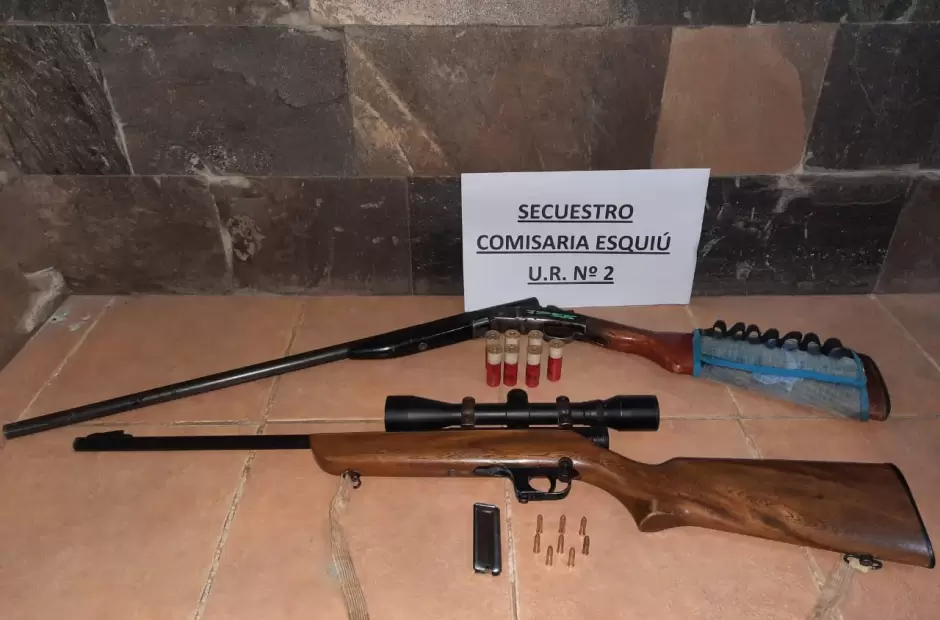 Previo a tomar las medidas de seguridad correspondientes, los policías hicieron descender del utilitario Kangoo, color gris, dominio AA121SB a los sujetos, identificándose estos como Enrique Smit, Cristian Giron, Antonio y Segundo Moyano. Seguidamente, los efectivos requisaron el interior del utilitario, hallando en el mismo dos armas de fuego, tratándose de una escopeta sin marca visible, calibre 16, portando siete cartuchos y una carabina marca Mahely modelo ST-700 calibre 22 con mira telescópica marca Hikenin, con el respectivo cargador de quita y pon con ocho. Al momento de solicitarle la documentación de dichas armas, los ocupantes manifestaron no contar con la misma, por lo que se procedió al secuestro preventivo de las armas. Sin embargo, no se tomaron medidas contra la libertad personal de los sujetos.