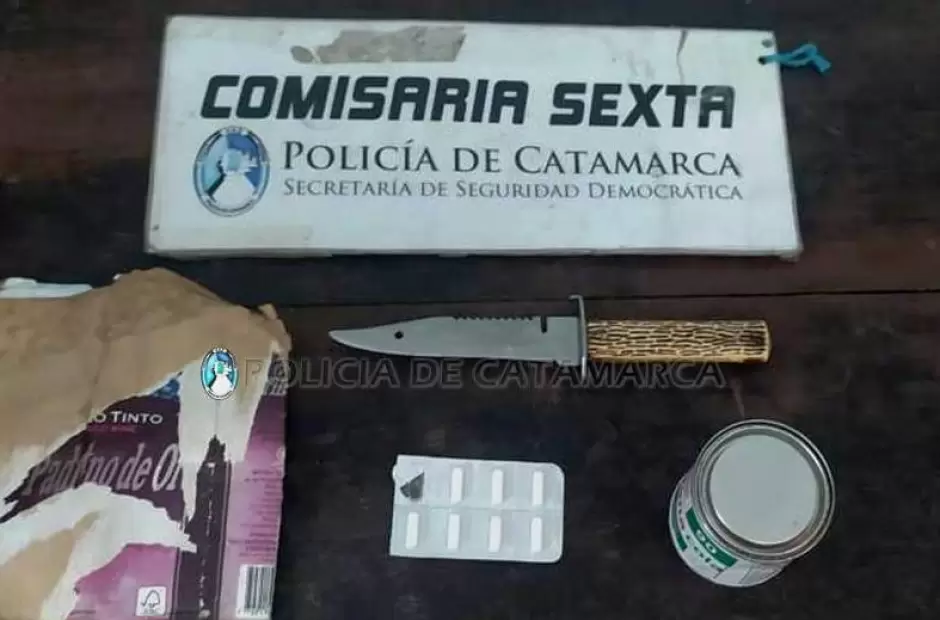 Cabe destacar que, durante el procedimiento, el aprehendido intentó agredir físicamente al personal policial interviniente, no logrando su cometido, y al realizarle la requisa correspondiente, los policías encontraron entre sus prendas de vestir un arma blanca, un blíster de pastillas, una caja de vino, y una lata de pegamento, que quedaron en calidad de secuestro.