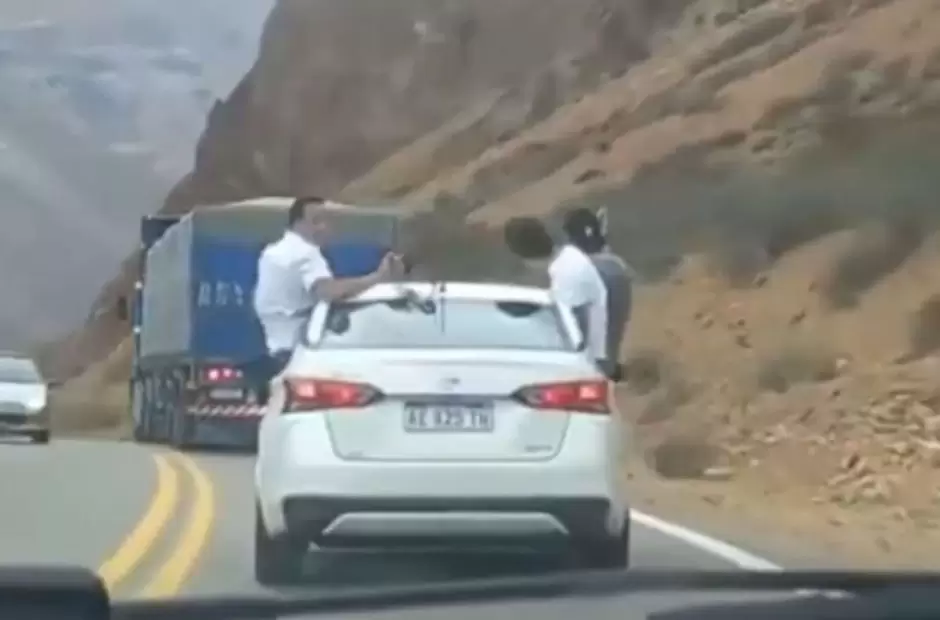 Cuatro turistas fueron registrados mientras realizaban una maniobra peligrosa en el corredor internacional en la provincia de Mendoza. Las personas que viajaban decidieron filmarse cuando estaban sentados con la mitad del cuerpo fuera del vehículo en el que iban.