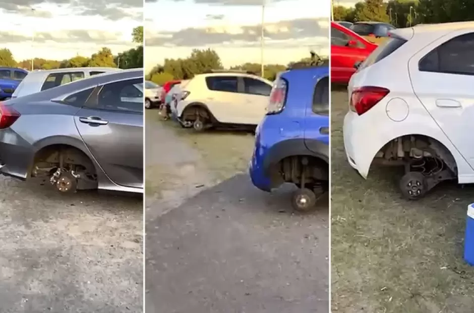 Las imágenes muestran a por lo menos cuatro autos que fueron víctimas del robo de cubiertas, pese a que supuestamente unos 3000 policías aseguraban la seguridad del lugar.