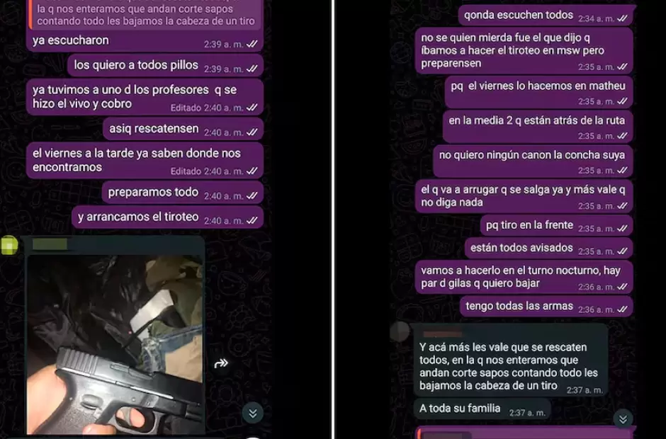 Según confirmaron fuentes del caso al sitio Infobae, en los mensajes, un alumno de la escuela Fray Luis Beltrán prometía disparar en el colegio hoy viernes por la tarde. El estudiante arengaba a sus compañeros con la frase "Los quiero a todos pillos" y mencionaba que un profesor ya había sido atacado ("ya cobró"). Además, los menores compartieron una foto de un revólver en el chat.