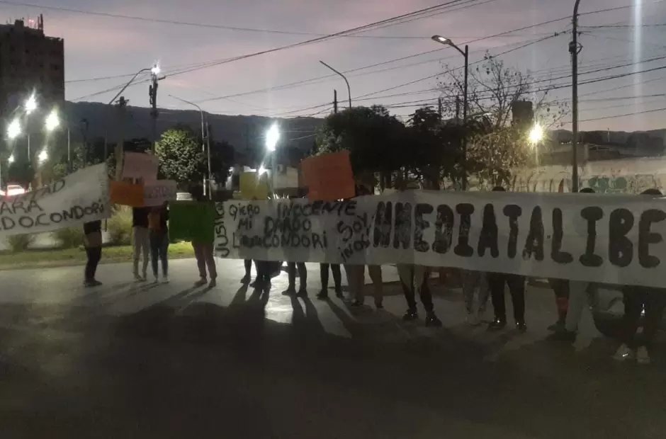 Condori arribó al edificio de la fiscalía general trasladado por el personal del penal, donde cumple la prisión preventiva. En el ingreso a la fiscalía, un grupo de familiares y amigos se acercaron para acompañarlo y pedir por su liberación.