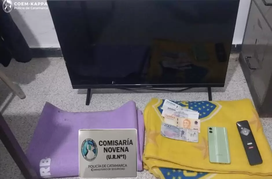 Más tarde, en la esquina de la avenida Amatista y calle San Juan, los policías aprehendieron a los presuntos autores del delito, dos hombres de apellidos Rodríguez (34) y Acosta (34), como así también lograron recuperar un (01) televisor de 32 pulgadas, un (01) teléfono celular, una (01) lona y una (01) colcha, que quedaron en calidad de secuestro al igual que la suma de veintitrés mil doscientos pesos ($23.200) en efectivo.