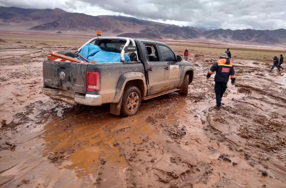 En horas de la mañana en Antofagasta de la Sierra, personal del Grupo G.E.R. de la base de alta montaña, protagonizó el rescate de una familia que había quedado atascada en un lodazal, a bordo de su vehículo.