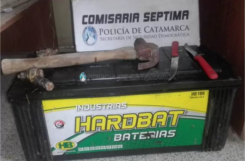 A las 06:40 de la mañana de hoy, mientras personal de la Comisaría Séptima recorría preventivamente por la calle Balcozna al 900, del barrio Eva Perón, observó a un sujeto llevando una batería marca Harbat HB 180 tensión 12 V. de color negro, y al percatarse de la presencia policial habría sacado de entre sus prendas de vestir un martillo con mango marrón e intentó agredir físicamente a los efectivos, no logrando su cometido.