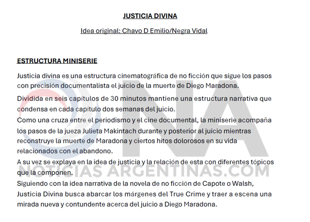 "Siguiendo con la idea narrativa de la novela de no ficción de Capote o Walsh, Justicia Divina busca abarcar los márgenes del True Crime y traer a escena una mirada nueva y contundente acerca del juicio a Diego Maradona", continúa la explicación en detalle del documental.